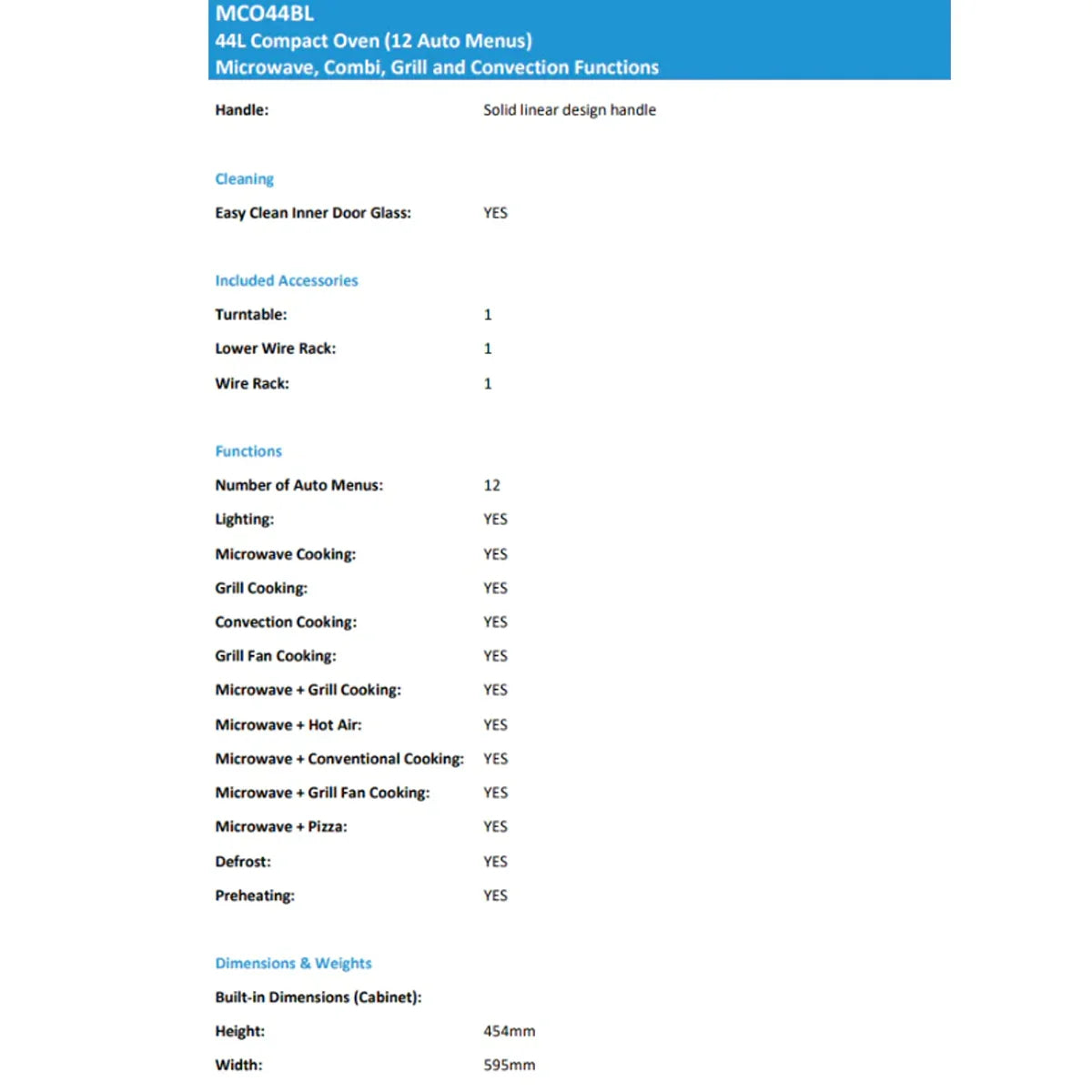 44L Compact Oven (12 Auto Menus) Microwave, Combi, Grill and Convection Functions.