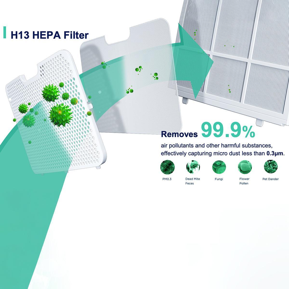 Changeable H13 HEPA Filter to remove 99.9% of air pollutants and other harmful substances, effectively capturing micro dust less than 0.3μm.